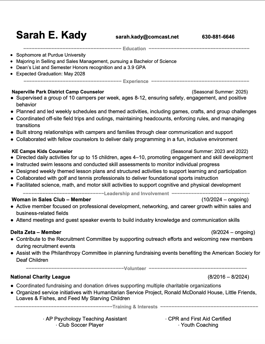 In both academic and professional environments, I focus on building strong relationships, communicating effectively, and working collaboratively with others. Through roles such as camp counselor, involvement in Women in Sales, and serving on Delta Zeta’s Recruitment and Philanthropy Committees, I have developed strong leadership, organization, and interpersonal skills.